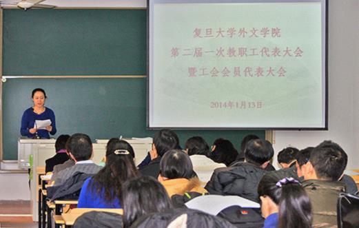 外文学院二届一次教职工代表大会暨工会会员代表大会在完成所有会议议程后,2014年1月13日下午在五教5108教室胜利闭幕。参加大会共有47名教代会正式代表。受大会筹备组邀请,校工会副主席金再勤、校党的群众路线教育实践活动第十二督导组组长顾云深、学院上一届教代会和工会代表、学院离退休党支部代表、学院离退休老教授协会代表、学院在职教授和教师代表,党支部书记代表等列席大会。大会由院党委副书记曾建彬同志主持,在雄壮的《国歌》声中开幕。