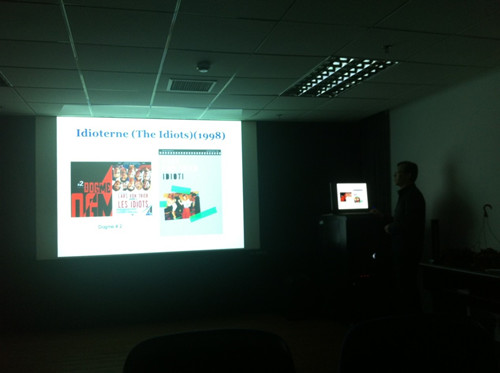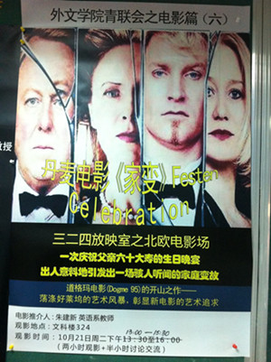 10月21日,外文学院青联会举行第六次活动,在文科楼324房间放映了北欧电影《家宴》。来自日语系、韩语系、俄语系、德语系的十几位老师参加了观摩。放映之前,影片推荐人朱建新老师为大家介绍了北欧独特的电影艺术流派----道格玛电影。而《家宴》这部电影正是集中反映了道格玛电影的主体理念:反全球化、反好莱坞、反资产阶级、反欧洲伪文艺电影。