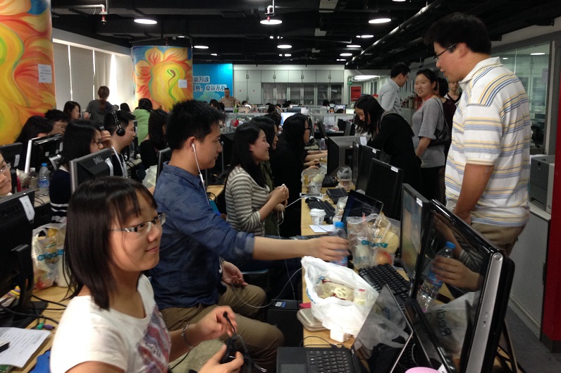 老师们慰问了正在努力工作中的同学们,并与两节活动组织方的领导同志交谈,了解情况。此次两节实习期已过半,学生们纷纷表示通过此次实习,不仅得到了专业能力上的锻炼,也因要承担繁忙的工作而增强了自己的责任心与耐心。前来慰问的几位老师亲切询问了学生们的翻译情况,并给大家加油打气,鼓励大家能交出自己满意的翻译作品。