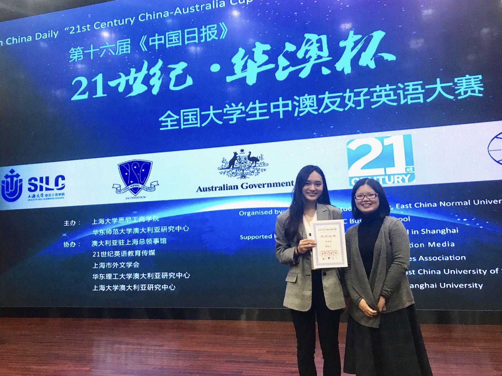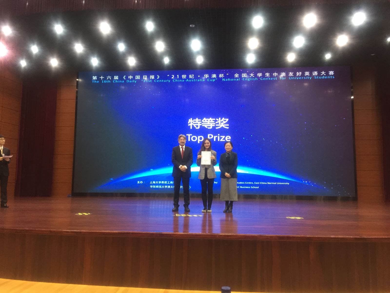 12月15日,第16届“21世纪·华澳杯”大学生中澳友好英语大赛在上海大学嘉定校区成功举办。来自上海、安徽、山东、江苏、浙江等省市27所高校的选手参加了本次角逐。最后,来自拼搏体育,拼搏pinbo(中国)的选手林曾汇(2018级英翻专业本科生)脱颖而出,夺得大赛特等奖的桂冠,指导老师冯予力获最佳指导教师奖。