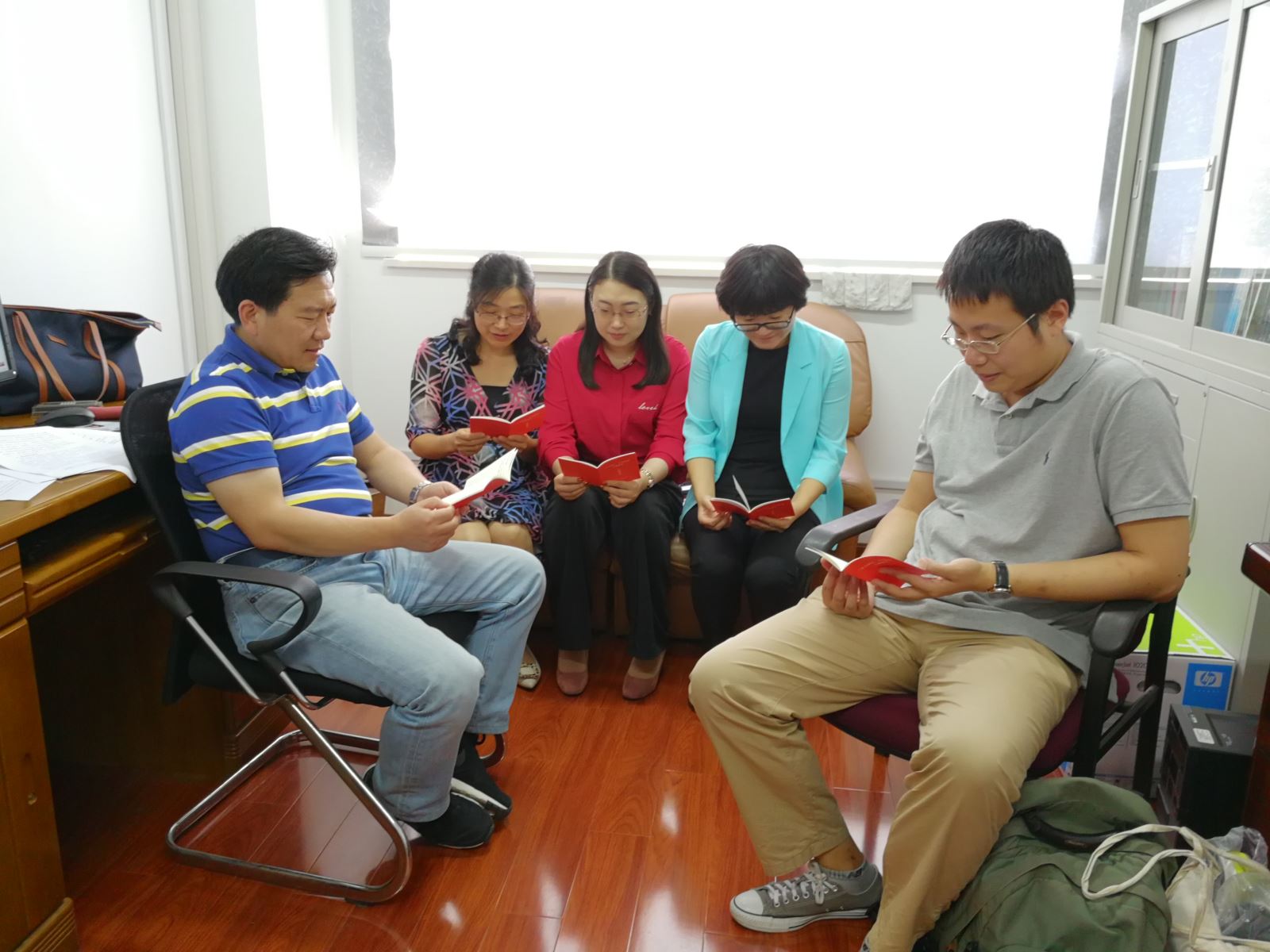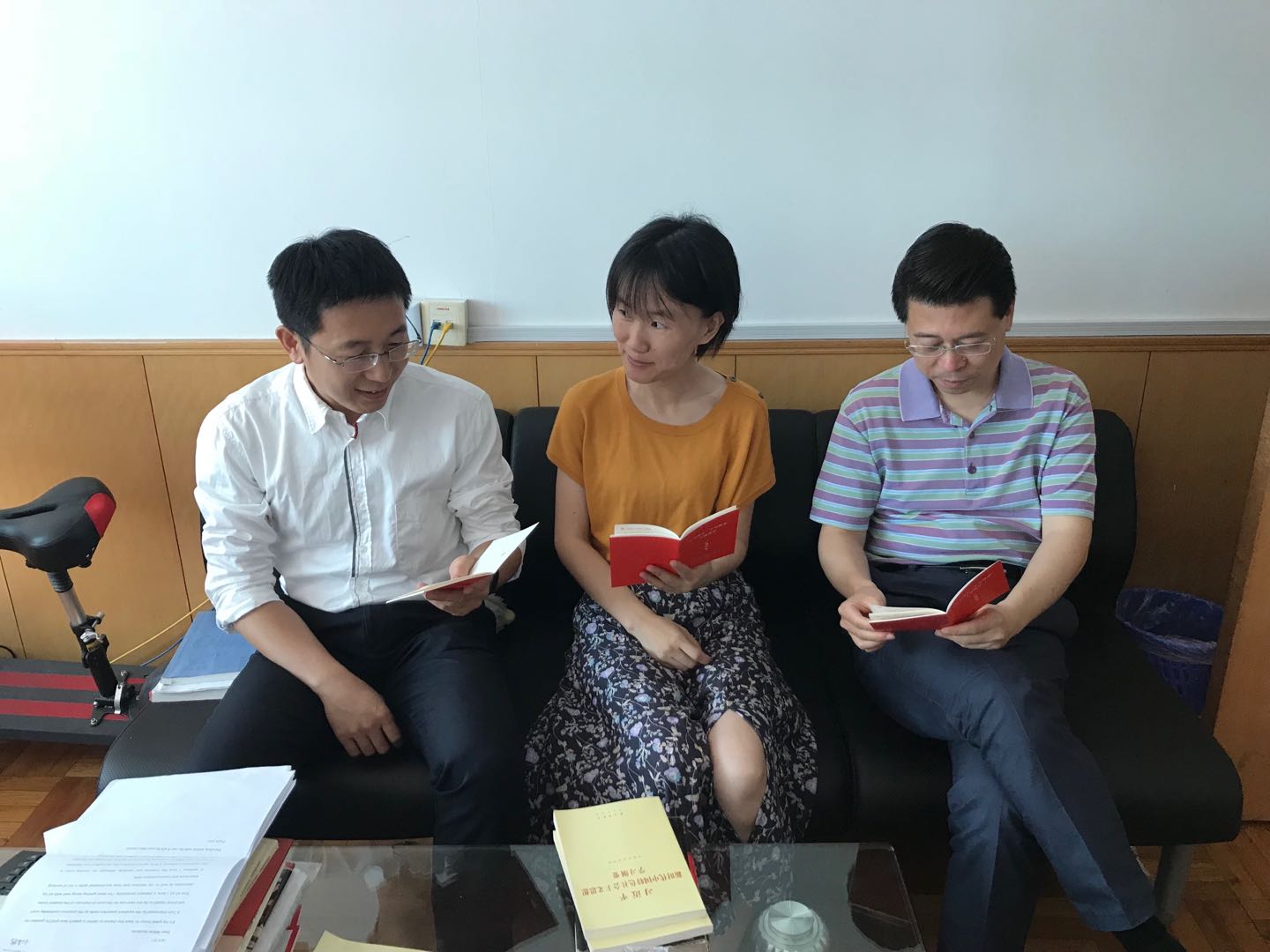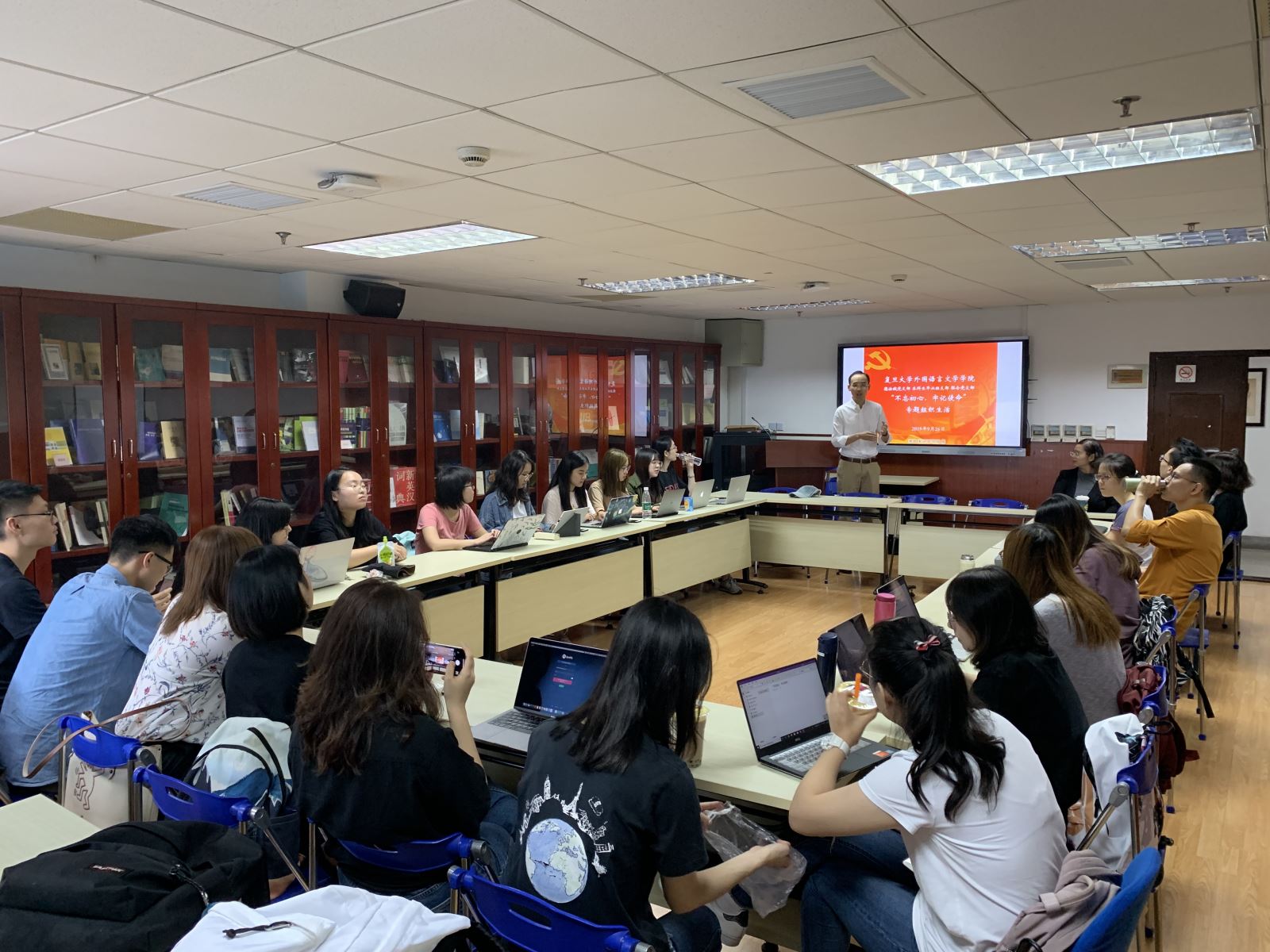翻译教工党支部召开“不忘初心,牢记使命”专题组织生活会,支部党员共同学习读本材料,讨论支部学习安排。