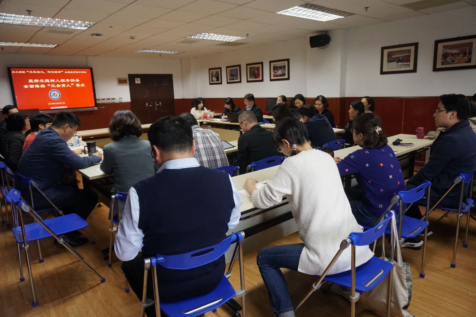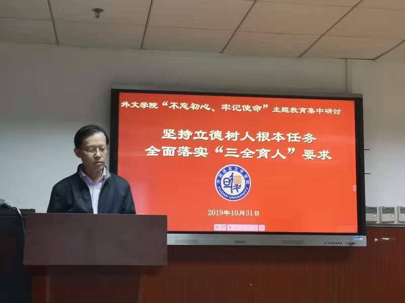 10月31日下午,外文学院党政领导班子举行“不忘初心、牢记使命”第五次集中研讨学习,党委书记罗英华主持学习,校党委第五巡回指导组组长张宏莲、联络员邵田到会指导,学院各系、部负责人列席了会议。大家围绕“坚持立德树人根本任务,全面落实‘三全育人’要求”主题,在重点学习《习近平总书记关于教育的重要论述摘编》、习近平总书记在全国教育大会、全国高校思想政治工作会议、学校思想政治理论课教师座谈会和北京大学师生座谈会上的重要讲话精神的基础上,聚焦宗旨性质和担当作为、落实立德树人根本任务、加快推进“三全育人”进行了交流研讨。
