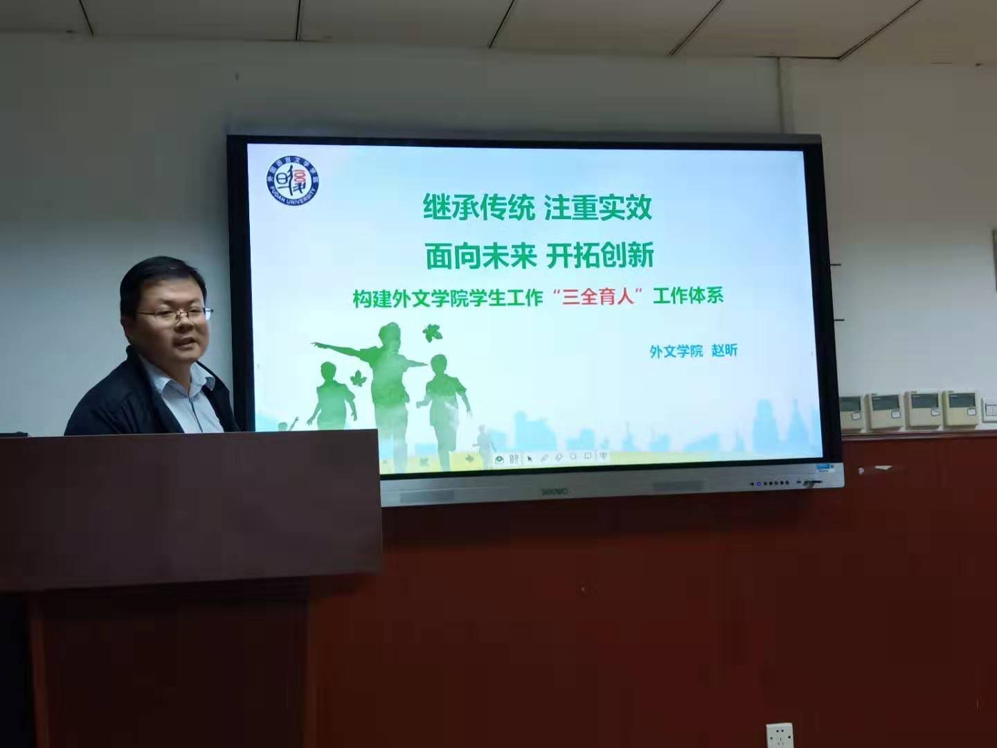 赵昕做了《继承传统,注重实效,面向未来,开拓创新——构建外文学院学生工作“三全育人”工作体系》的汇报,他表示,要围绕立德树人根本任务,以队伍建设为基础、以学生党建为引领、以实践育人为抓手、以创新发展为驱动,统筹各方育人资源力量,激发全员育人主体活力,将思政工作贯通育人全过程,全方位覆盖育人空间场域,突出问题导向和改革创新,深入推进“三全育人”。