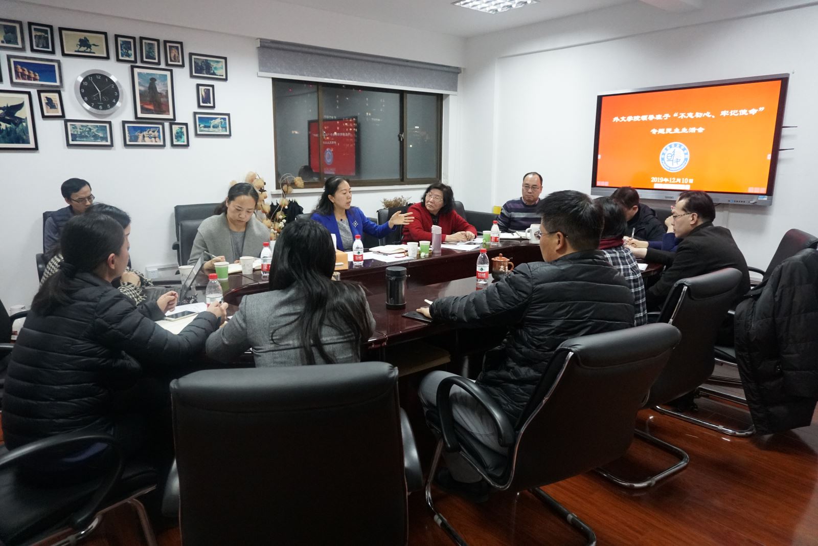 外文学院党委对本次专题民主生活会高度重视,会前做了充分准备。在“不忘初心、牢记使命”主题教育中通过个人自学与集体研讨相结合的方式,深入学习习近平新时代中国特色社会主义思想特别是习近平总书记关于教育的重要论述,跟进学习党的十九届四中全会精神,先后组织党政领导班子开展了7次集中研讨、1场专家报告、2次参观学习。通过个别访谈、设立意见箱、召开座谈会等多种方式广泛听取师生意见建议, 先后召开7场座谈会,梳理了30余条问题。按照民主生活会的要求,根据“四个对照”、“四个找一找”,学院党政主要领导与班子成员,领导班子成员之间,开展了谈心谈话,交换意见,指出不足,提出建议。在此基础上,罗英华主持了领导班子检视剖析材料的撰写工作,班子成员认真撰写了个人检视剖析材料。