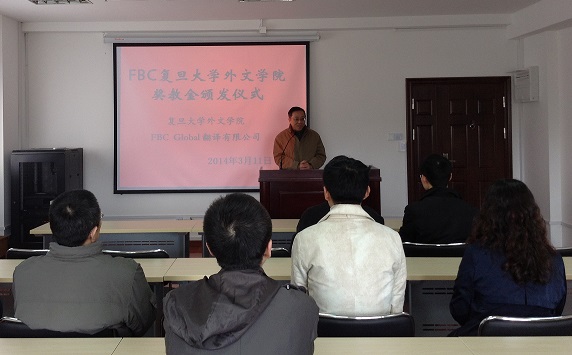 2014年3月11日下午1:30,外文学院2013年度FBC奖教金颁奖仪式在文科楼543召开。出席仪式的除了获奖教师外,还有外文学院和FBC GLOBAL翻译公司的相关负责人。