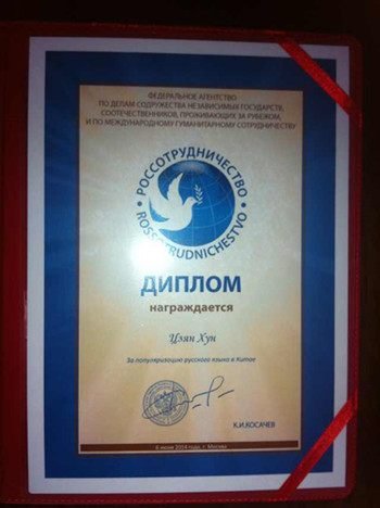 我院俄语系姜宏教授喜获俄罗斯外交部下属官方机构北京俄罗斯文化中心颁发的中国普及俄语荣誉奖。北京俄罗斯文化中心是根据中俄两国政府所签署的协定,由俄罗斯政府在中国境内成立的第一家文化单位,其宗旨是向中国各社会阶层推广俄罗斯不同领域的成就。俄语系姜宏教授因普及俄语和俄罗斯文化方面的突出成绩于2014年6月6日俄语日之际在北京获此殊荣。