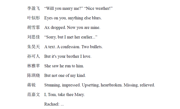 “英语一句话小说”大赛邀请全校师生用英语创作一句话小说,上传至外文节网络平台,通过微信平台进行投票,在闭幕式上为获奖同学颁奖并赠送精美礼品。活动共收到28份作品,内容或惊悚,或感人,或搞笑,吸引了各院同学的关注。